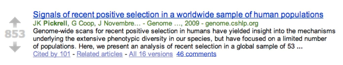- Connection to a social network. Of course, in some cases I don’t really care if a lot of people like a paper; instead, what I want to know is: do people I trust like the paper? If I’m trying to find the best recent papers on copy number variation, I don’t necessarily care if a thousand people like a paper, but I would probably take a second look at a paper recommended by (my GNZ colleague and copy number variation expert) Don Conrad.